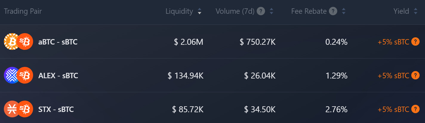 ALEX liquidity pool yields involving sBTC all receive a bonus 5% sBTC yield.