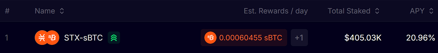 At the time of writing, the sBTC/STX liquidity pair has an estimated APY of over 20%