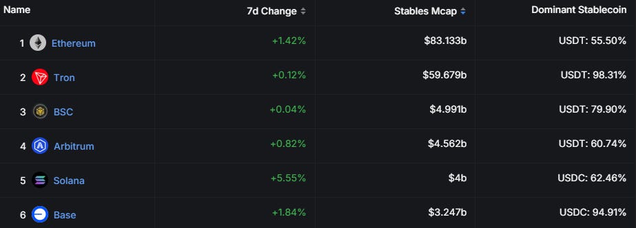Notable stablecoin market cap percentage increases include Ethereum, Solana and Base.