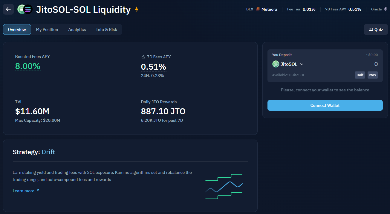 For those holding either SOL or JitoSOL (JitoSOL is a liquid staking token that’s already earning nearly 8% APY), you can deposit either of these assets into the JitoSOL-SOL Liquidity pool on Kamino to earn 8% APY and Meteora Points.
