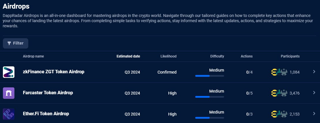 Use DappRadar to find top trending contracts, and head to the Rewards tab to find data on the latest airdrops: the estimated airdrop date, the likelihood of the airdrop, the actions required to qualify, and how many users are participating.