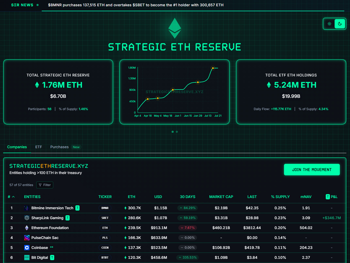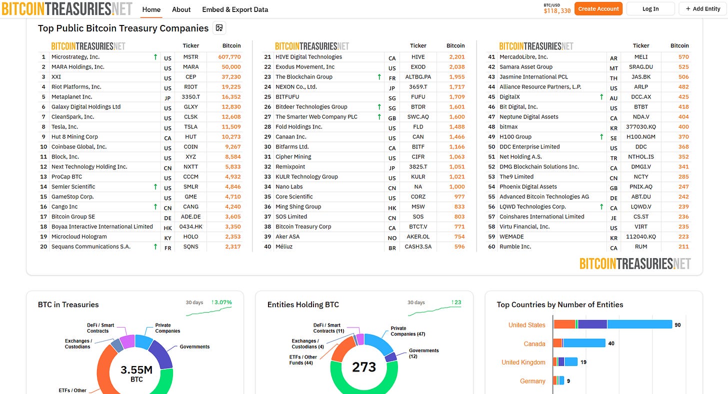 BitcoinTreasuries.net tracks the top Bitcoin treasuries, and strategicethreserve.xyz tracks Ethereum treasuries.