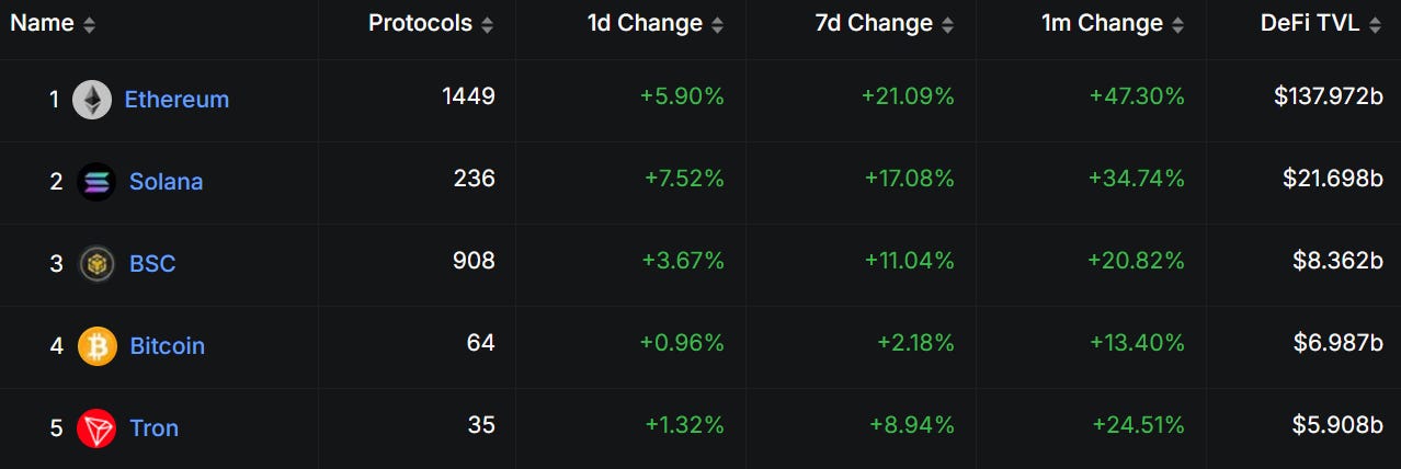 Ethereum’s rising tide is lifting the DeFi space higher: TVL on nearly all chains is up, Chain Ecosystem Fees are going up (signaling increased usage), and sentiment is overwhelmingly positive for ETH. Over the last week, ETH overtook BTC for the #1 mindshare spot in the industry.