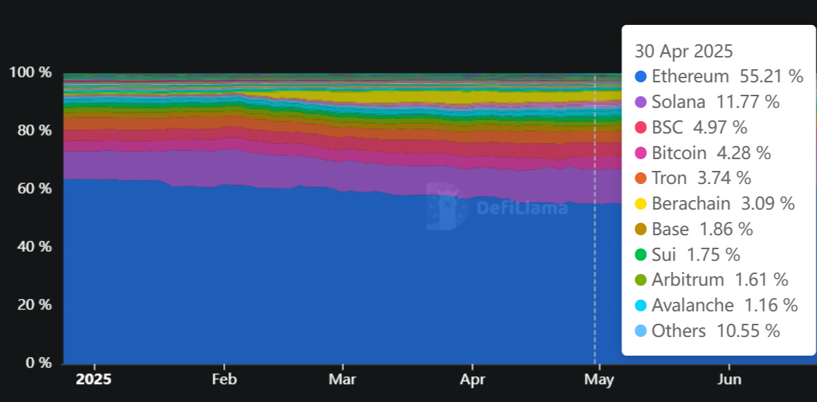 90 days ago, Ethereum sentiment was at all-time lows. The chain went from holding 65% of all TVL in crypto down to 55%.