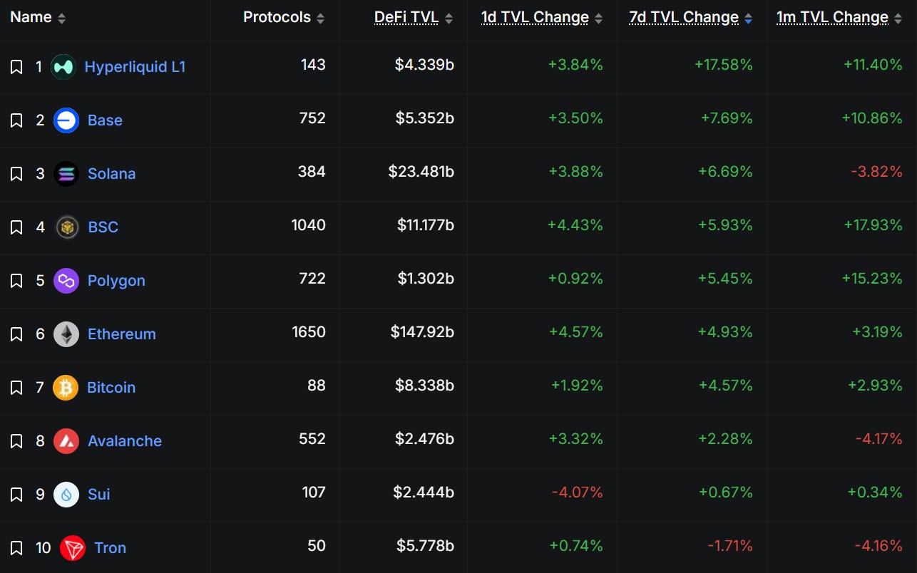 Hyperliquid L1 takes the cake with a nearly 18% boost in 7d TVL.