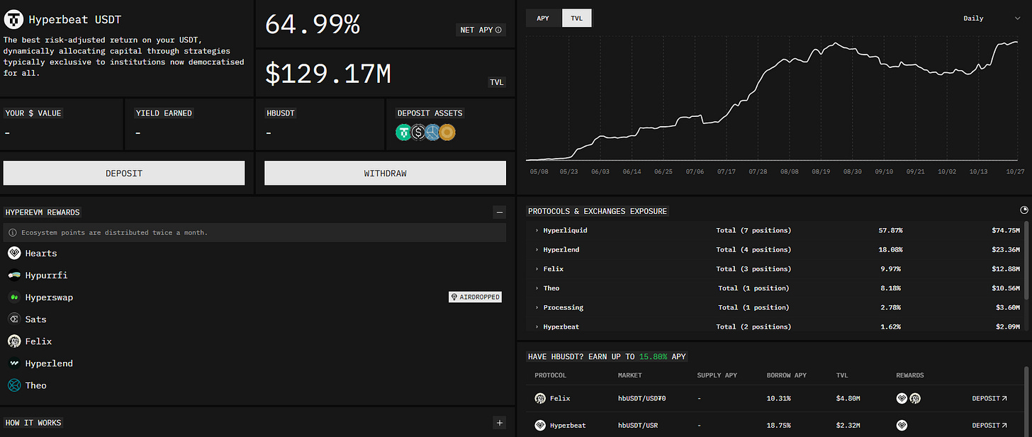 Hyperbeat’s USDT vault offers 65% APY on USDT0 deposits.