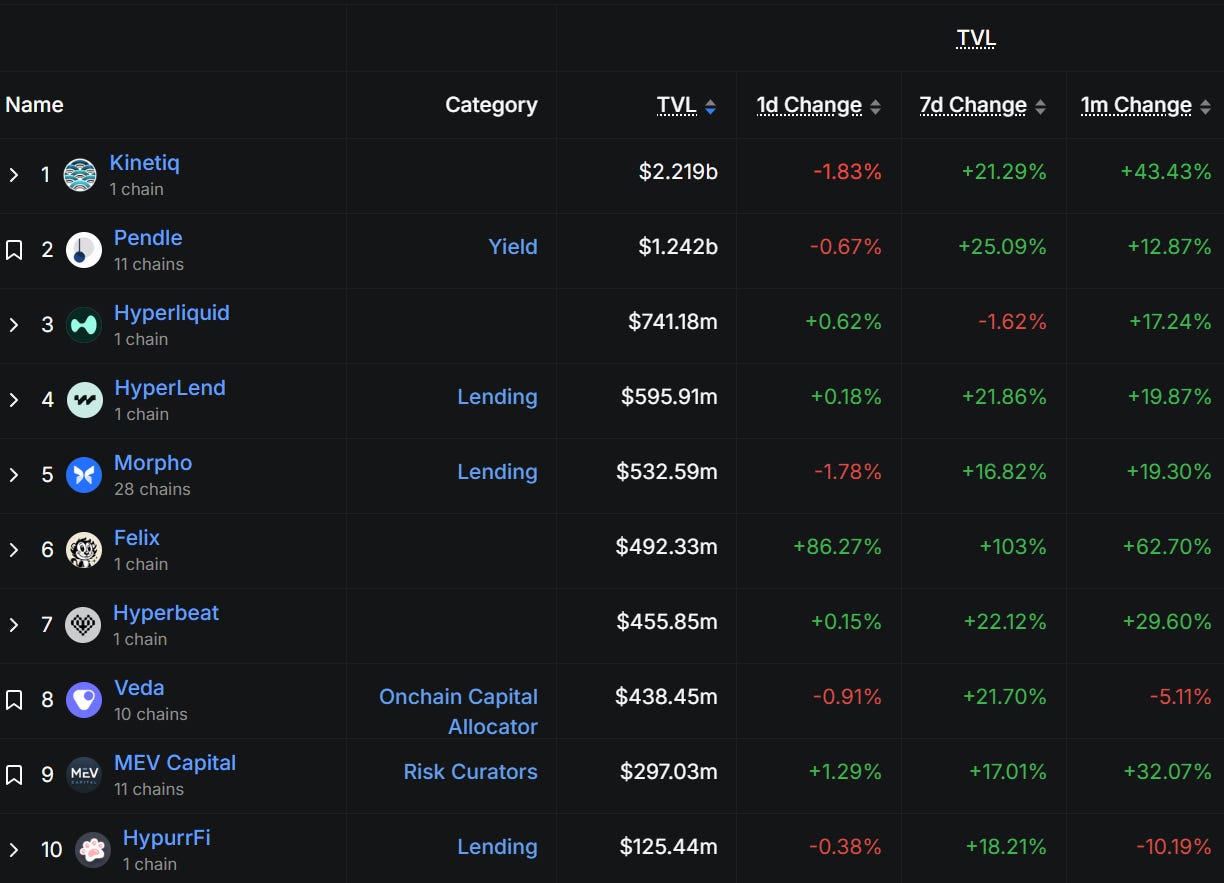 Taking a closer look at Hyperliquid protocols, many are up 20%+ in 7d TVL.