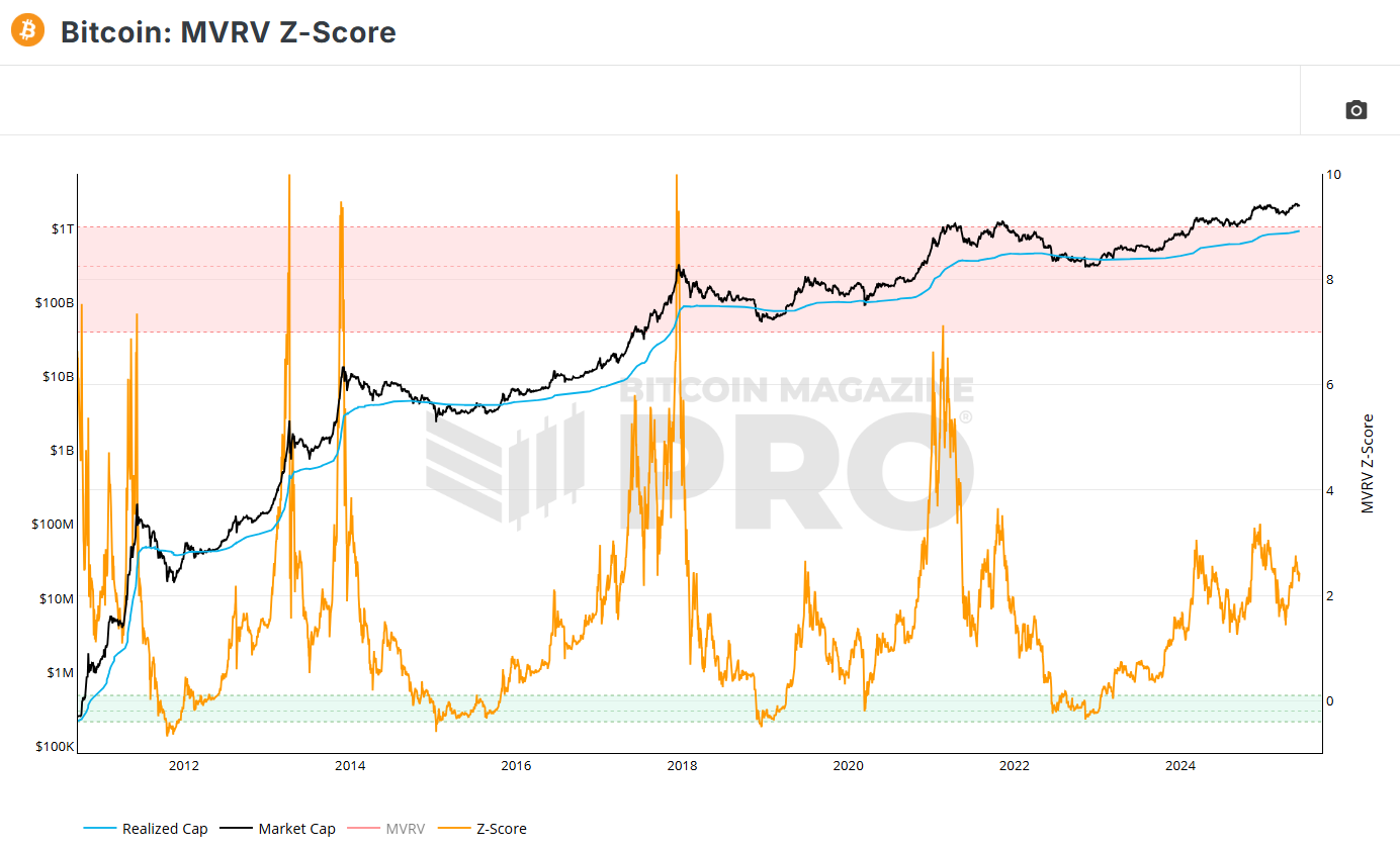 The Bitcoin MVRV Z-Score is a chart that values Bitcoin’s price vs its onchain “fair value” overtime. This metric is helpful to identify periods of mania, where market value is far above realized value.