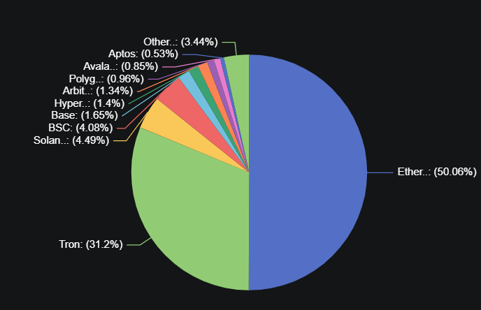 Tron holds nearly $80b in stablecoin market cap onchain, second only to Ethereum’s $124b. In dominance terms, ETH has 50% of market share, and Tron has 31%.