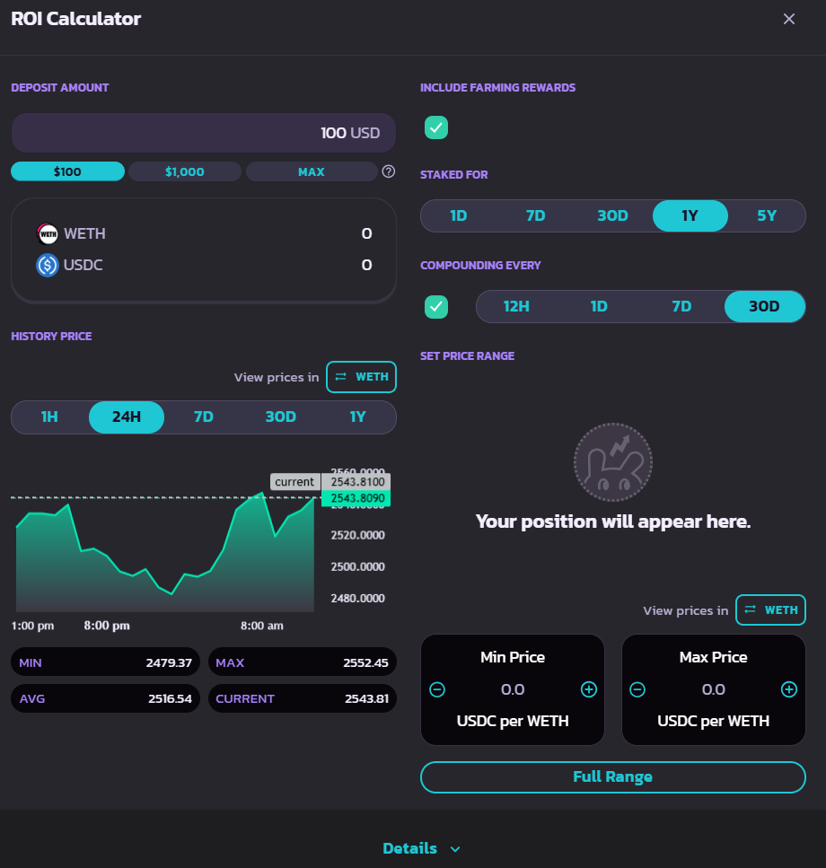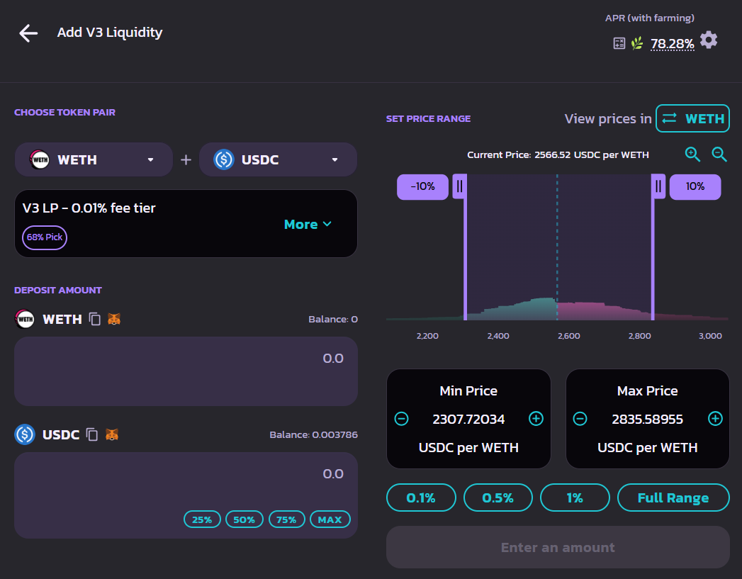 Once your wallet is connected, you’ll select “Add Liquidity”. Select a range in which to earn trading rewards. A 10% range to the upside and downside gives your position 20% range flexibility.