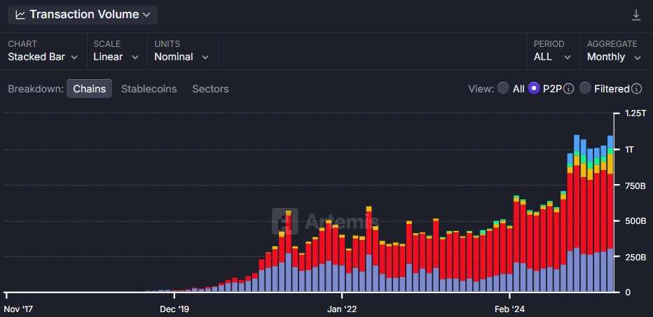 Tron leads all chains in P2P Transaction Volume - which is a signal for real usage, as this volume is only counted if stables are transferred from one user’s wallet to another.
