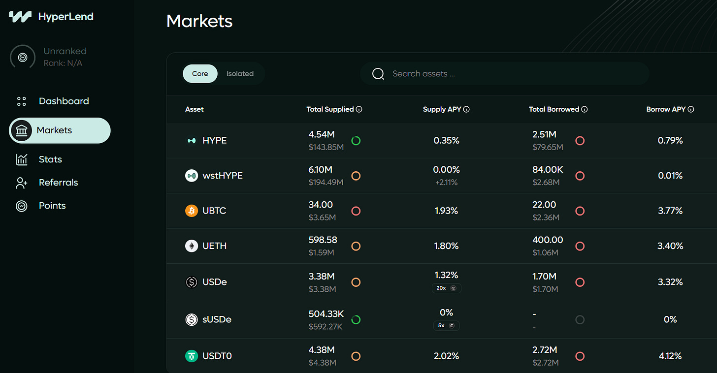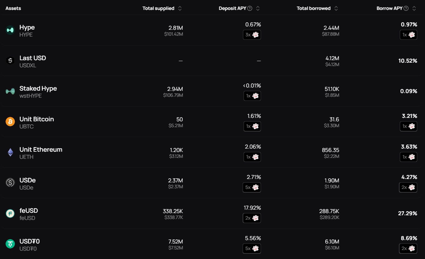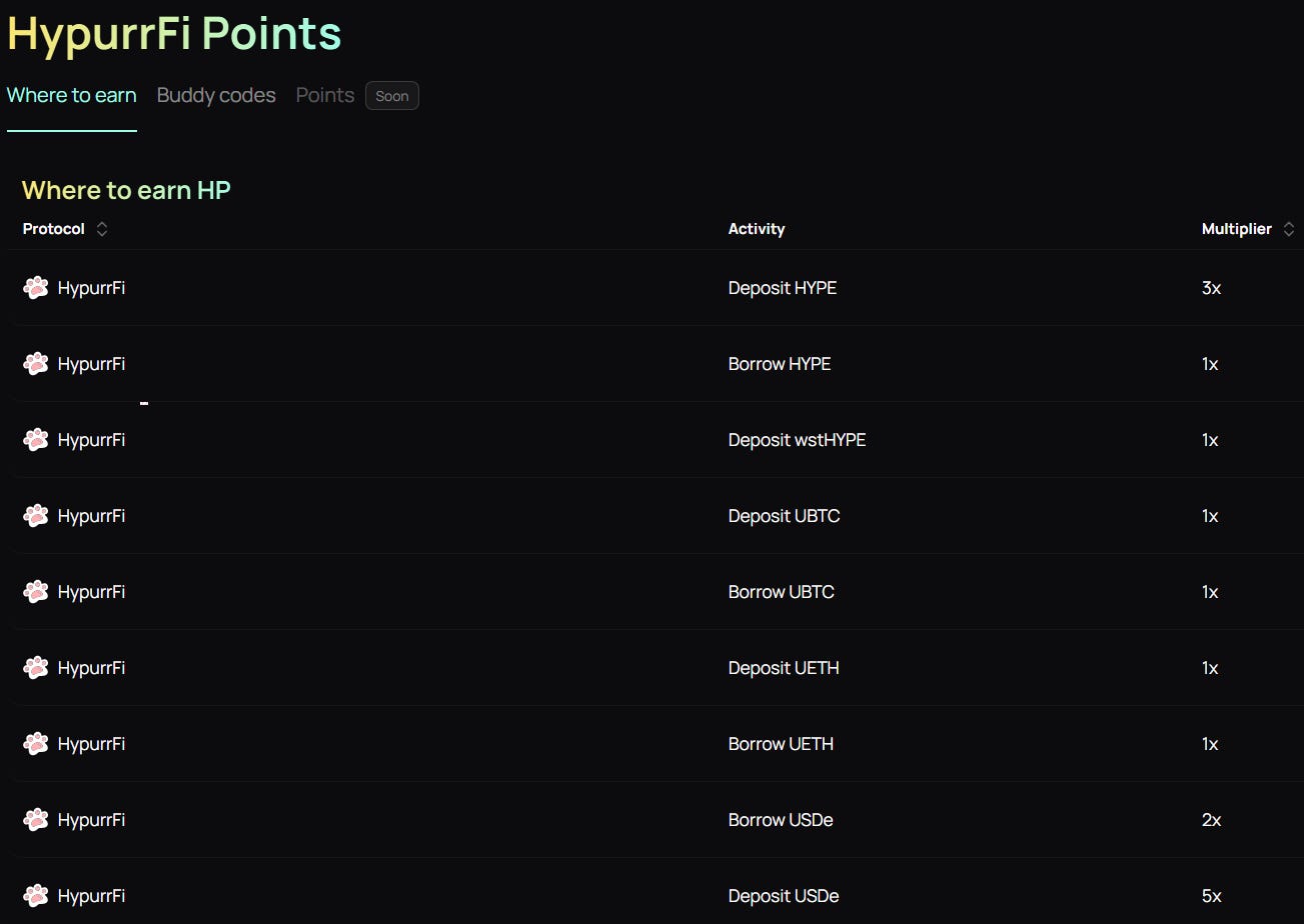 HypurrFi is running a points system (HP). Look for the pawprints for point multipliers.