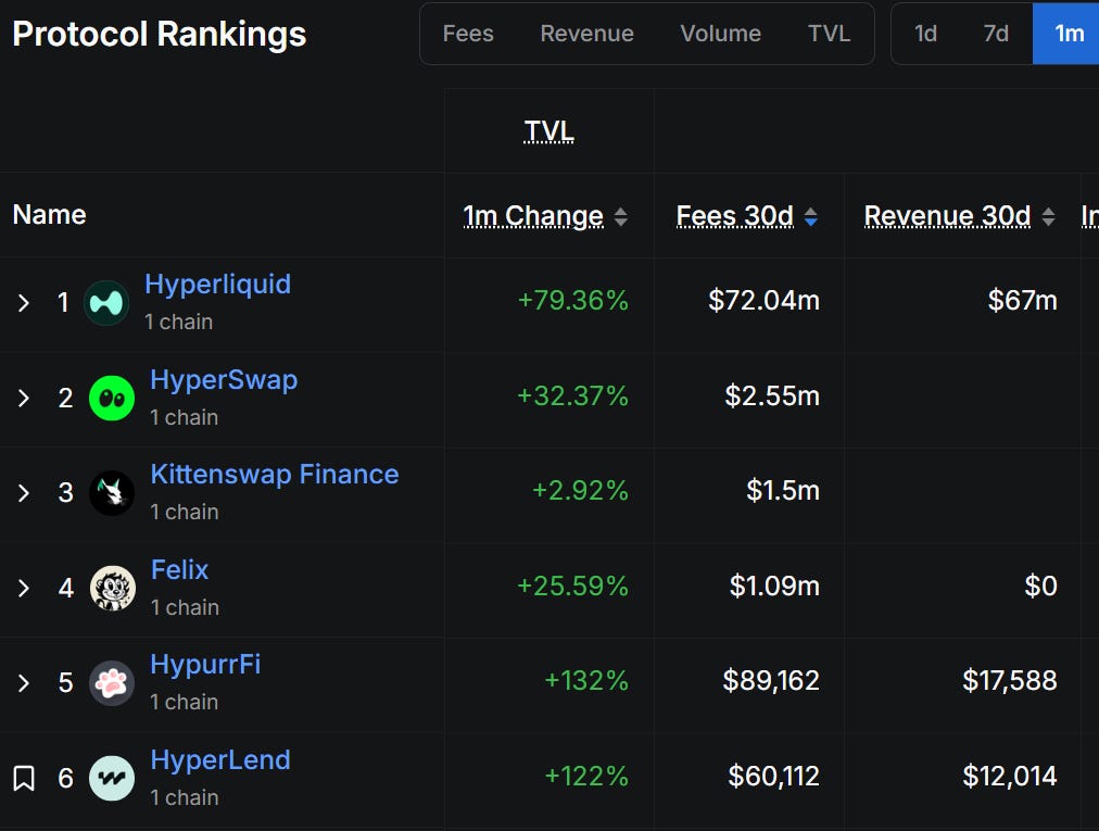 Use DeFiLlama to track HyperEVM protocols. We want to see protocols that are growing. Whether it’s TVL, fees, revenue, volume, etc.