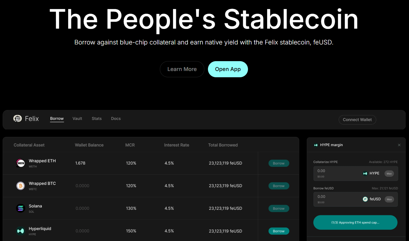 Felix is a CDP & lending protocol with the Felix stablecoin feUSD.