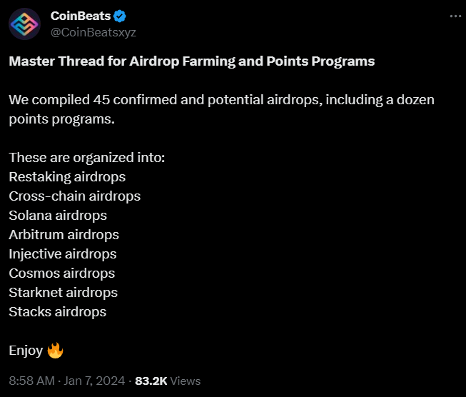 This thread by CoinBeats, a new educational company I founded, outlines 45 potential airdrops, with active points programs highlighted: