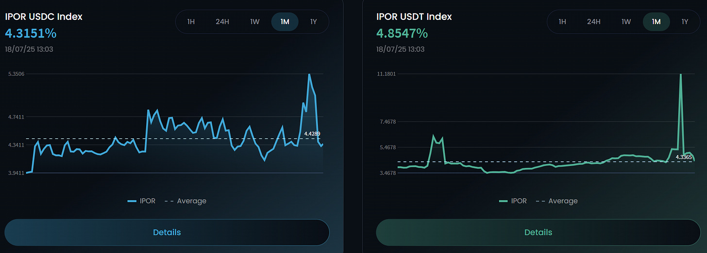 Rates for both USDT & USDC are trending up over the last month. They’re still well below the baseline for this year, but the upward trend and spike yesterday show demand for onchain borrowing is increasing.