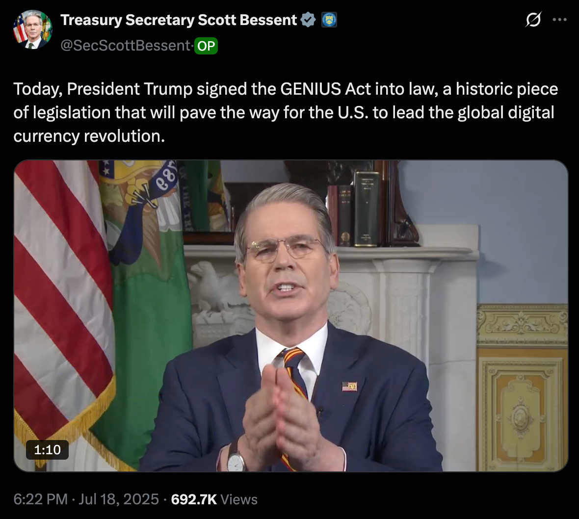 Imagine going back in time two years, when friends were losing bank accounts, fighting SEC suits or even facing criminal charges over their involvement in the crypto industry and showing them this video of the US Treasury Secretary pledging to make the US the global leader in digital assets, even as the President signs into a pro-crypto regulatory framework. Fan fiction would have been more believable.