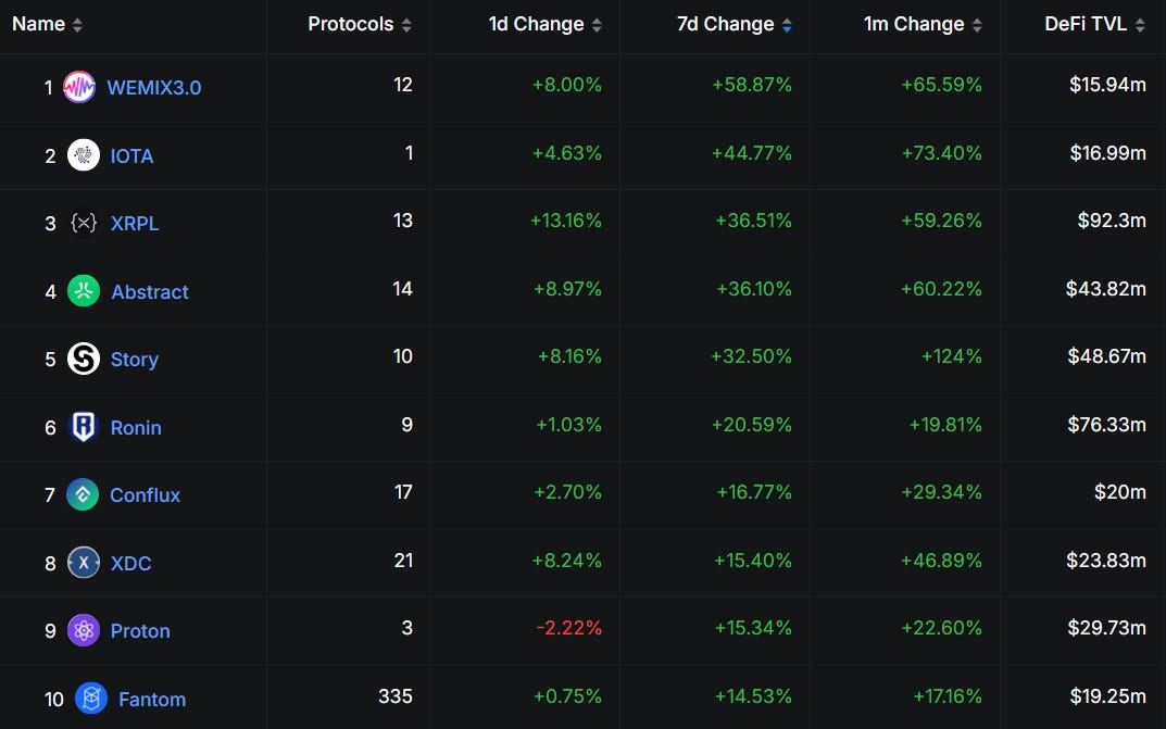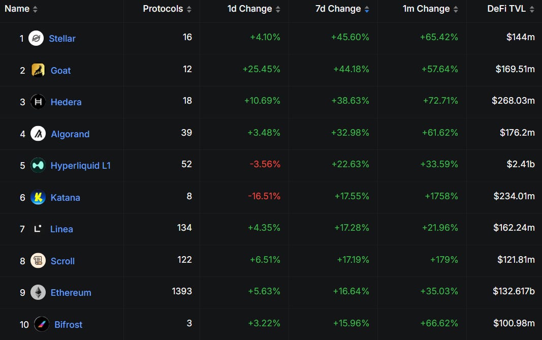 Stellar leads TVL growth this week. Goat, Hedera, and Algorand are all seeing growth across all timeframes.