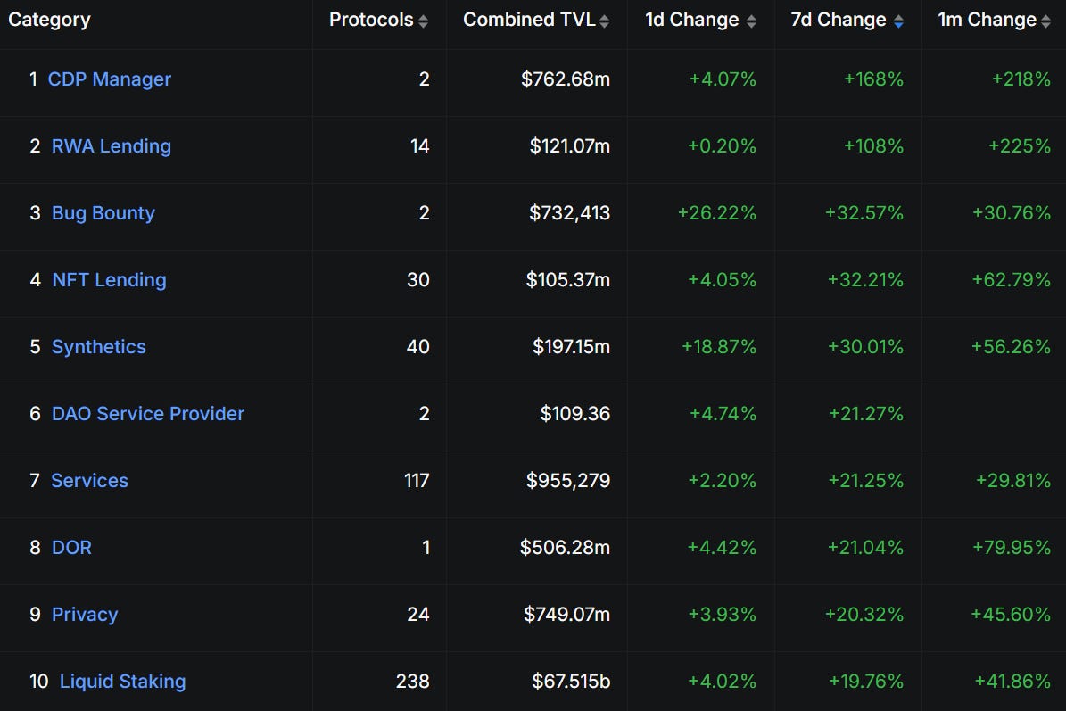 CDP managers are seeing the most growth in TVL for the 2nd week in a row. RWA lending, part of the larger RWA narrative getting some time in the spotlight, saw TVL double this week.