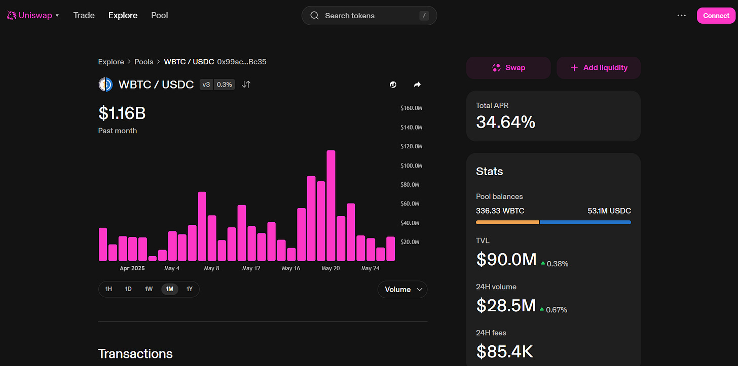 With elevated trading volume, the WBTC-USDC pool on Uniswap currently boasts a 30% APY.
