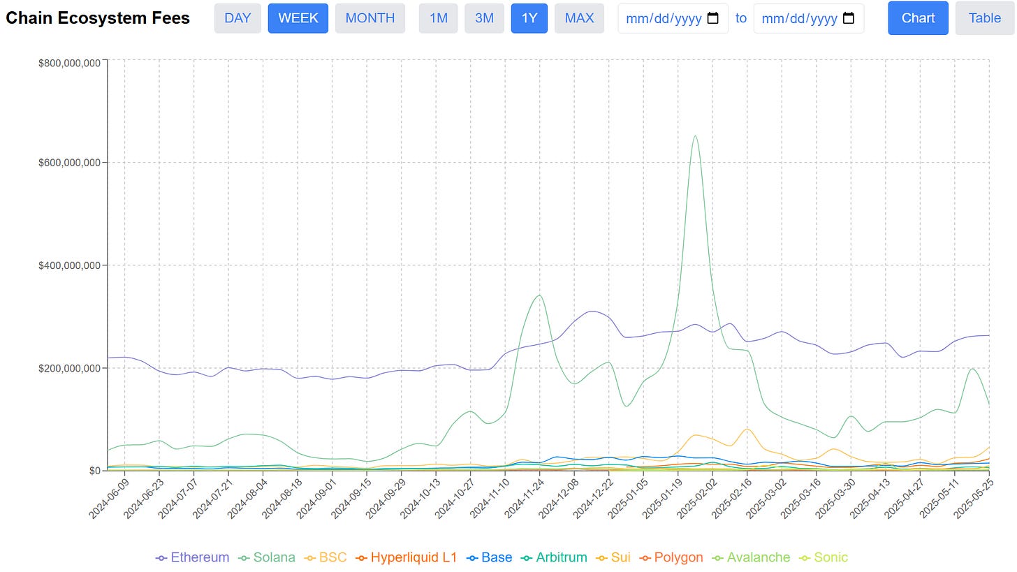 On the Chain Ecosystem Fees dashboard, we can see activity trending up over the last year.