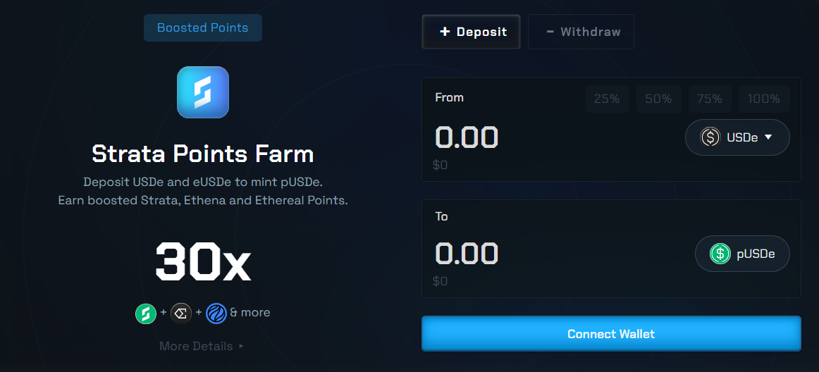 To deposit, head to Strata’s deposit page. you’ll need USDe (you can swap for that just about anywhere). Simply connect your wallet and deposit to start earning points.