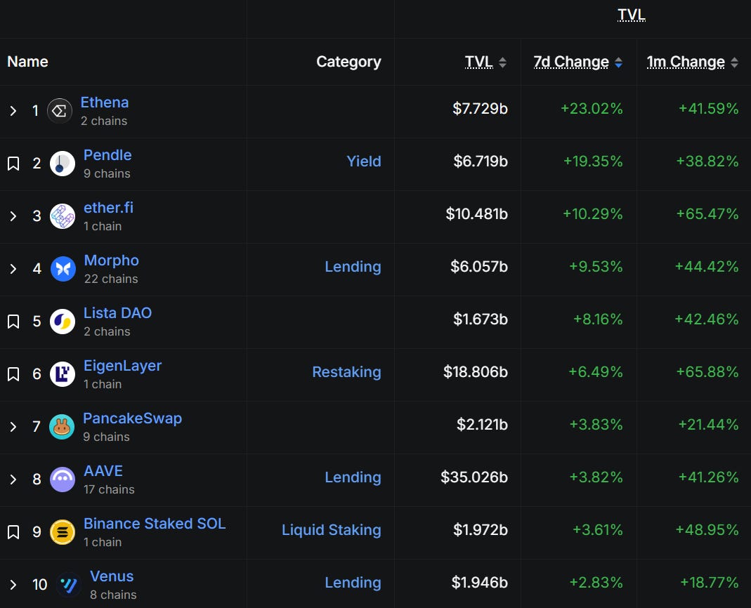 Protocols behind TVL growth this week include Ethena and Pendle - both had ~20% TVL growth and EtherFi TVL grew over 10%.